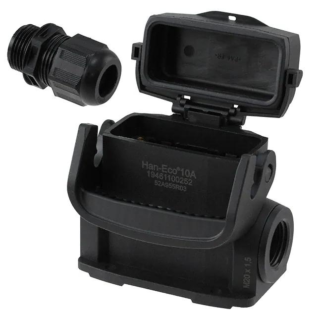 This is manufactured by HARTING. The manufacturer part number is 19461100252. The product has a current rating of 10a. The product is available in surface mount configuration. The product han eco, is a highly preferred choice for users. It has a typical thread size of m20. Whereas, the 10a is the manufacture's size code. It comes in connector housing configuration. Additionally, the product is designed with side entry Style. It is assigned with possible HTSUS value of 8538.90.8180. The product is rohs3 compliant. The product has -40°c ~ 125°c operating temperature range. Its typical moisture sensitivity level is 1 (unlimited). In addition, it is reach unaffected. It has an integral black housing colour. It is shipped in bulk. base - box mount Connector type offer robust functionality. The product's diameters include 3.173" l x 1.969" w x 2.407" h (80.60mm x 50.00mm x 61.15mm). It has a long 12 weeks standard lead time. The product also features robust polyamide (pa), nylon, glass filled housing material. It is IP rated with ip65 - dust tight, water resistant. The splendid features of the product include cover. The product han-eco®, is a highly preferred choice for users. Lock Type & Location Information: locking clip (1) on base bottom. The product is available in 10a size. Moreover, it corresponds to 19461100, a base product number of the product. The product is designated with the ear99 code number
