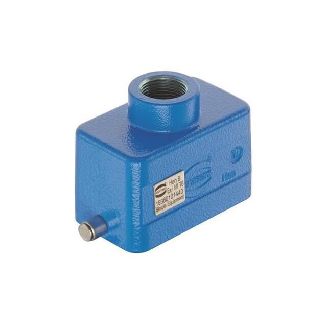 This is manufactured by HARTING. The manufacturer part number is 19360101440. Additionally, the product is designed with top entry Style. It is assigned with possible HTSUS value of 8538.90.8180. The product is rohs3 compliant. It has a typical thread size of m20. The product has -20°c ~ 40°c operating temperature range. Its typical moisture sensitivity level is not applicable. The product's housing has finished with a rugged powder coated. In addition, it is reach unaffected. It has an integral blue housing colour. It is shipped in bulk. hood Connector type offer robust functionality. The product's diameters include 2.858" l x 1.693" w x 1.772" h (72.60mm x 43.00mm x 45.00mm). The product also features robust zinc, die cast housing material. It is IP rated with ip65 - dust tight, water resistant. The product han® ex, is a highly preferred choice for users. Lock Type & Location Information: locking clip (1) on base bottom. The product is available in 10b size. Moreover, it corresponds to 19360101, a base product number of the product. The product is designated with the ear99 code number