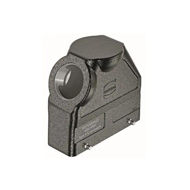 This is manufactured by HARTING. The manufacturer part number is 19370240523. Additionally, the product is designed with side entry Style. It is assigned with possible HTSUS value of 8538.90.8180. The product is rohs3 compliant. It has a typical thread size of m40. The product has -40°c ~ 125°c operating temperature range. Its typical moisture sensitivity level is not applicable. In addition, it is reach unaffected. It has an integral black housing colour. It is shipped in bulk. hood Connector type offer robust functionality. The product also features robust aluminum, die cast housing material. It is IP rated with ip65/ip66/ip67 - dust tight, water resistant, waterproof. The product han® m, is a highly preferred choice for users. Lock Type & Location Information: locking clip (2) on base bottom. The product is available in 24b size. Moreover, it corresponds to 19370240, a base product number of the product. The product is designated with the ear99 code number