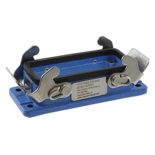 This is manufactured by HARTING. The manufacturer part number is 09365161301. Additionally, the product is designed with bottom entry Style. It is assigned with possible HTSUS value of 8538.90.8180. The product is rohs3 compliant. The product has -20°c ~ 40°c operating temperature range. Its typical moisture sensitivity level is not applicable. The product's housing has finished with a rugged powder coated. In addition, it is reach unaffected. It has an integral blue housing colour. It is shipped in bulk. base - panel mount Connector type offer robust functionality. The product's diameters include 4.646" l x 1.906" w x 1.232" h (118.00mm x 48.40mm x 31.30mm). It has a long 11 weeks standard lead time. The product also features robust zinc, die cast housing material. It is IP rated with ip65 - dust tight, water resistant. The product han® ex, is a highly preferred choice for users. Lock Type & Location Information: locking clip (2) on base bottom. The product is available in 16b size. Moreover, it corresponds to 09365161, a base product number of the product. The product is designated with the ear99 code number