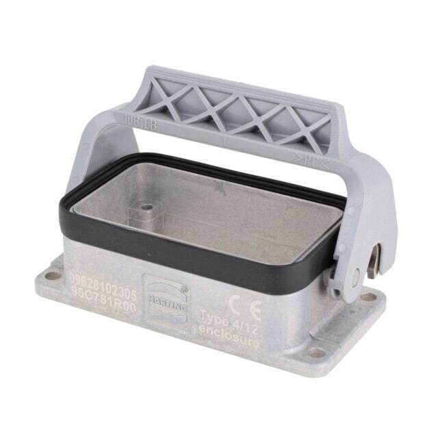 This is manufactured by HARTING. The manufacturer part number is 09628102305. Additionally, the product is designed with bottom entry Style. It is assigned with possible HTSUS value of 8538.90.8180. The product is rohs3 compliant. The product has -40°c ~ 125°c operating temperature range. Its typical moisture sensitivity level is 1 (unlimited). In addition, it is reach unaffected. It is shipped in bulk. base - panel mount Connector type offer robust functionality. The product's diameters include 3.661" l x 1.732" w x 1.177" h (93.00mm x 44.00mm x 29.90mm). It has a long 15 weeks standard lead time. The product also features robust aluminum, die cast housing material. It is IP rated with ip66 - dust tight, water resistant. The product han®, is a highly preferred choice for users. Lock Type & Location Information: locking clip (1) on base bottom. The product is available in 10b size. Moreover, it corresponds to 09628102, a base product number of the product. The product is designated with the ear99 code number