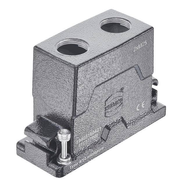This is manufactured by HARTING. The manufacturer part number is 19405160421. Additionally, the product is designed with top entry, dual Style. It is assigned with possible HTSUS value of 8538.90.8180. The product is rohs3 compliant. It has a typical thread size of m25. The product has -40°c ~ 125°c operating temperature range. Its typical moisture sensitivity level is 1 (unlimited). The product's housing has finished with a rugged powder coated. It has an integral black housing colour. It is shipped in bulk. hood Connector type offer robust functionality. It has a long 11 weeks standard lead time. The product also features robust aluminum, die cast housing material. It is IP rated with ip65/ip68/ip6k9k - dust tight, water resistant, waterproof. The product han® hpr, is a highly preferred choice for users. Lock Type & Location Information: screw locks on hood. The product is available in 16hpr size. The product is designated with the ear99 code number