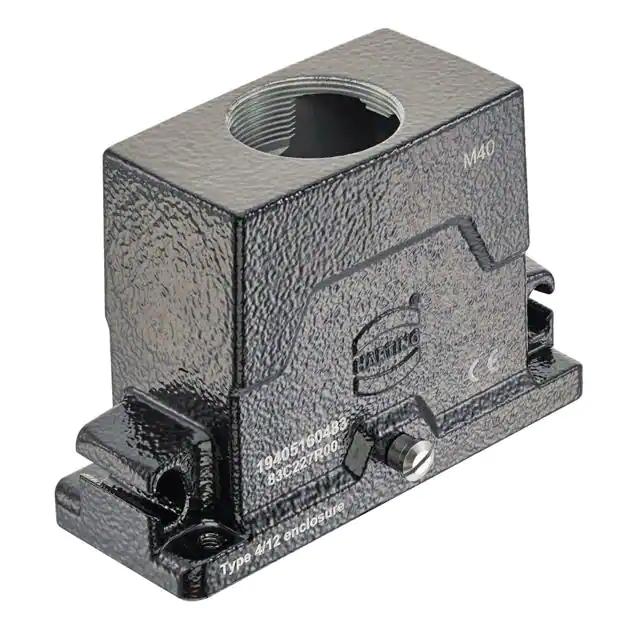 This is manufactured by HARTING. The manufacturer part number is 19405160483. Additionally, the product is designed with top entry Style. It is assigned with possible HTSUS value of 8538.90.8180. The product is rohs3 compliant. It has a typical thread size of m40. The product has -40°c ~ 125°c operating temperature range. Its typical moisture sensitivity level is 1 (unlimited). The product's housing has finished with a rugged powder coated. It has an integral black housing colour. It is shipped in bulk. hood Connector type offer robust functionality. It has a long 11 weeks standard lead time. The product also features robust aluminum, die cast housing material. It is IP rated with ip65/ip68/ip69k - dust tight, water resistant, waterproof. The product han® hpr, is a highly preferred choice for users. Lock Type & Location Information: locking clip (1) on base bottom. The product is available in 16hpr size. The product is designated with the ear99 code number