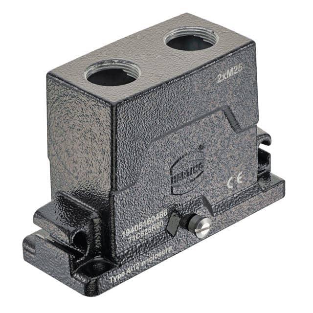 This is manufactured by HARTING. The manufacturer part number is 19405160486. Additionally, the product is designed with top entry, dual Style. It is assigned with possible HTSUS value of 8538.90.8180. The product is rohs3 compliant. It has a typical thread size of m25. The product has -40°c ~ 125°c operating temperature range. Its typical moisture sensitivity level is 1 (unlimited). The product's housing has finished with a rugged powder coated. It has an integral black housing colour. It is shipped in bulk. hood Connector type offer robust functionality. It has a long 11 weeks standard lead time. The product also features robust aluminum, die cast housing material. It is IP rated with ip65/ip68/ip6k9k - dust tight, water resistant, waterproof. The product han® hpr, is a highly preferred choice for users. Lock Type & Location Information: locking clip (1) on base bottom. The product is available in 16hpr size. The product is designated with the ear99 code number