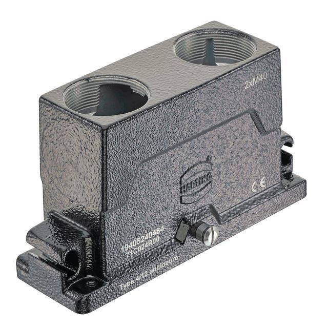 This is manufactured by HARTING. The manufacturer part number is 19405240484. Additionally, the product is designed with top entry, dual Style. It is assigned with possible HTSUS value of 8538.90.8180. The product is rohs3 compliant. It has a typical thread size of m40. The product has -40°c ~ 125°c operating temperature range. Its typical moisture sensitivity level is 1 (unlimited). The product's housing has finished with a rugged powder coated. It has an integral black housing colour. It is shipped in bulk. hood Connector type offer robust functionality. It has a long 11 weeks standard lead time. The product also features robust aluminum, die cast housing material. It is IP rated with ip65/ip68/ip69k - dust tight, water resistant, waterproof. The product han® hpr, is a highly preferred choice for users. Lock Type & Location Information: locking clip (1) on base bottom. The product is available in 24hpr size. The product is designated with the ear99 code number