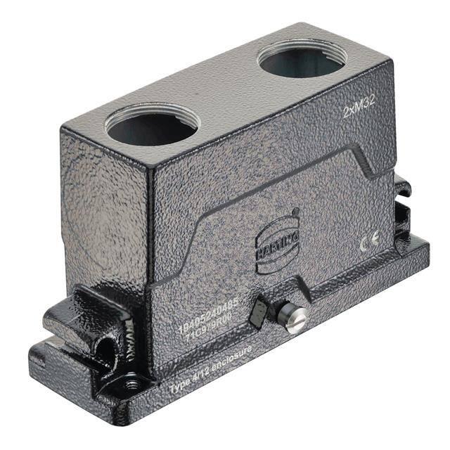 This is manufactured by HARTING. The manufacturer part number is 19405240485. Additionally, the product is designed with top entry, dual Style. It is assigned with possible HTSUS value of 8538.90.8180. The product is rohs3 compliant. It has a typical thread size of m32. The product has -40°c ~ 125°c operating temperature range. Its typical moisture sensitivity level is 1 (unlimited). The product's housing has finished with a rugged powder coated. It has an integral black housing colour. It is shipped in bulk. hood Connector type offer robust functionality. It has a long 11 weeks standard lead time. The product also features robust aluminum, die cast housing material. It is IP rated with ip65/ip68/ip6k9k - dust tight, water resistant, waterproof. The product han® hpr, is a highly preferred choice for users. Lock Type & Location Information: locking clip (1) on base bottom. The product is available in 24hpr size. The product is designated with the ear99 code number