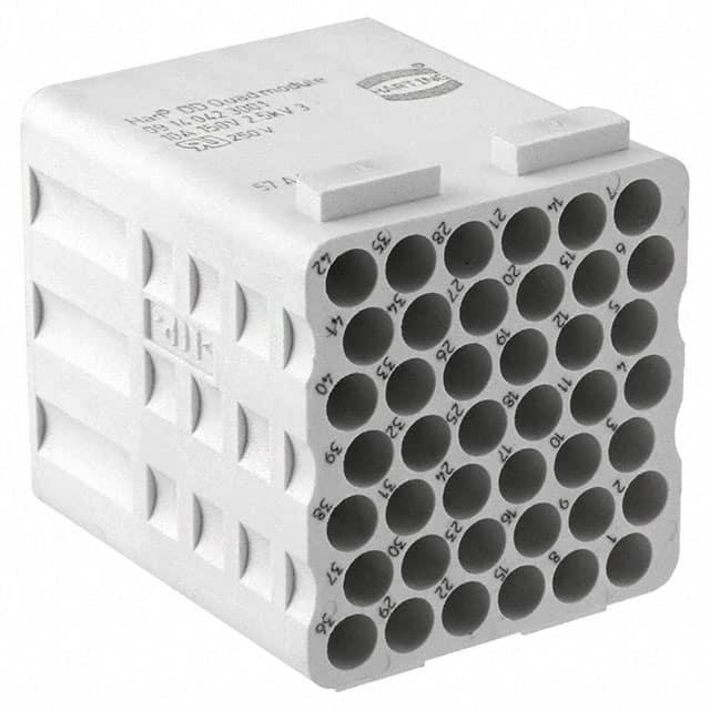 This is manufactured by HARTING. The manufacturer part number is 09140423001. The product has a current rating of 10a. Moreover, the product has a nominal 150 v voltage rating. In addition, male is the available "Gender" of the product. It comes in 7 of rows. The product han-modular, is a highly preferred choice for users. The product contains 42 contacts. It comes in connector module configuration. It is assigned with possible HTSUS value of 8536.69.8000. The product is rohs3 compliant. Moreover, it has crimp terminal style. The product also features robust liquid crystal polymer (lcp) housing material. The product has -40°c ~ 125°c operating temperature range. The product carries possible position value of 42. Moreover, the product has a nominal 150v voltage rating. In addition, it is reach unaffected. It carries ul94 v-0 of material flammability rating. It is shipped in bulk. insert without contacts Connector type offer robust functionality. Its typical moisture sensitivity level is 1 (unlimited). It has typical contact type of han® d. It has a long 18 weeks standard lead time. Additionally, the product's output is 10a It has a classic gray colour. The product han® dd, is a highly preferred choice for users. The product is designated with the ear99 code number Moreover, it corresponds to 09140423, a base product number of the product.