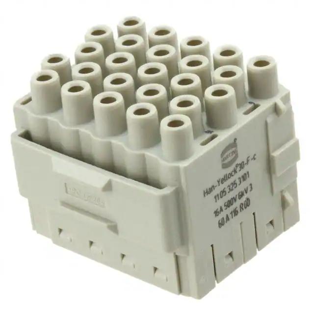 This is manufactured by HARTING. The manufacturer part number is 11053253101. It is assigned with possible HTSUS value of 8536.69.4030. The product is rohs3 compliant. Moreover, it has crimp terminal style. The product also features robust polycarbonate (pc) housing material. The product has -40°c ~ 125°c operating temperature range. The product carries possible position value of 25. Moreover, the product has a nominal 500v voltage rating. In addition, it is reach unaffected. It carries ul94 v-0 of material flammability rating. It is shipped in bulk. In addition, female is the available "Gender" of the product. module without contacts Connector type offer robust functionality. Its typical moisture sensitivity level is 1 (unlimited). It has typical contact type of han-yellock®. It has a long 15 weeks standard lead time. Additionally, the product's output is 16a It has a classic gray colour. The product han-yellock® 30, is a highly preferred choice for users. The product is designated with the ear99 code number Moreover, it corresponds to 11053253, a base product number of the product.