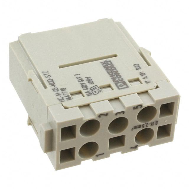 This is manufactured by Phoenix Contact. The manufacturer part number is 1647718. It is assigned with possible HTSUS value of 8536.69.8000. The product is rohs compliant. Moreover, it has tension clamp terminal style. The product also features robust polycarbonate (pc) housing material. The product has -40°c ~ 125°c operating temperature range. The product carries possible position value of 5. Moreover, the product has a nominal 600v voltage rating. It carries ul94 v-0 of material flammability rating. It is shipped in bulk. In addition, male is the available "Gender" of the product. module Connector type offer robust functionality. Furthermore, the product is galvanized with excellent silver contact finishing. Its typical moisture sensitivity level is 1 (unlimited). Additionally, the product's output is 16a The product heavycon® m, is a highly preferred choice for users. The product is designated with the ear99 code number The product is made from sturdy copper alloy materials.
