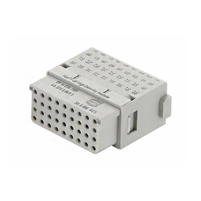 This is manufactured by HARTING. The manufacturer part number is 09140363101. It is assigned with possible HTSUS value of 8536.69.8000. The product is rohs3 compliant. Moreover, it has crimp terminal style. The product also features robust polycarbonate (pc) housing material. The product has -40°c ~ 125°c operating temperature range. The product carries possible position value of 36. Moreover, the product has a nominal 32v voltage rating. In addition, it is reach unaffected. It carries ul94 v-0 of material flammability rating. It is shipped in bulk. In addition, female is the available "Gender" of the product. module without contacts Connector type offer robust functionality. Its typical moisture sensitivity level is 1 (unlimited). It has a long 8 weeks standard lead time. Additionally, the product's output is 4a It has a classic gray colour. The product han-modular®, is a highly preferred choice for users. The product is designated with the ear99 code number Moreover, it corresponds to 09140363, a base product number of the product.