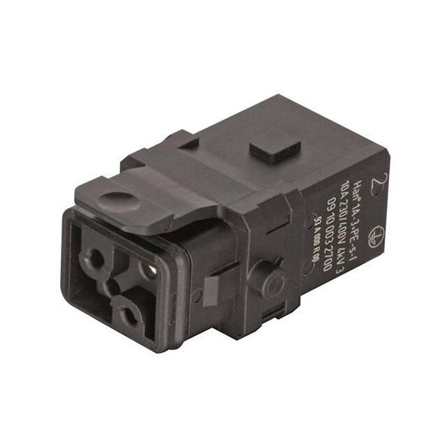 This is Han 1A-3+PE-S-f latch manufactured by HARTING. The manufacturer part number is 09100032700. The product has a current rating of 10a. In addition, female is the available "Gender" of the product. Moreover, the product has a nominal 230 v, 400 v voltage rating. It comes in 2 of rows. The product han 1a, is a highly preferred choice for users. The product contains 3 contacts. It comes in connector insert configuration. The product is made from sturdy copper alloy materials. It is assigned with possible HTSUS value of 8536.69.8000. The product is rohs3 compliant. Moreover, it has screw terminal style. The product also features robust polyamide (pa), nylon housing material. The product has -30°c ~ 90°c operating temperature range. The product carries possible position value of 3+ground. Moreover, the product has a nominal 400v voltage rating. In addition, it is reach unaffected. It carries ul94 v-0 of material flammability rating. It is shipped in bulk. insert Connector type offer robust functionality. Furthermore, the product is galvanized with excellent silver contact finishing. Its typical moisture sensitivity level is not applicable. The product is available in 1a size. Additionally, the product's output is 10a It has a classic black colour. The product han® 1a, is a highly preferred choice for users. The product is designated with the ear99 code number Moreover, it corresponds to 09100032, a base product number of the product.