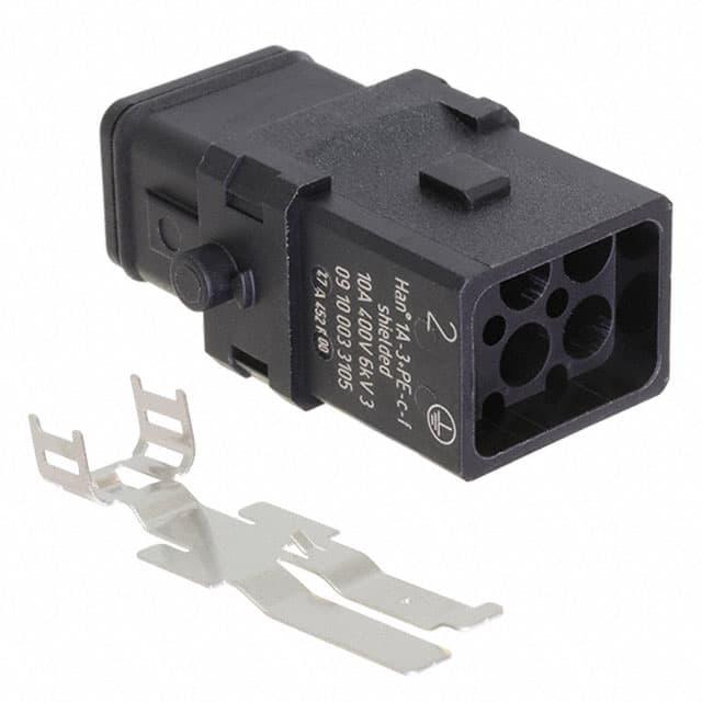 This is Han 1A-3+PE-C-f shielded manufactured by HARTING. The manufacturer part number is 09100033105. The product has a current rating of 10a. In addition, female is the available "Gender" of the product. Moreover, the product has a nominal 400 v voltage rating. It comes in 2 of rows. The product han 1a, is a highly preferred choice for users. The product contains 3 contacts. It comes in connector insert configuration. It is assigned with possible HTSUS value of 8536.69.8000. The product is rohs3 compliant. Moreover, it has crimp terminal style. The product also features robust polyamide (pa), nylon housing material. The product has -30°c ~ 90°c operating temperature range. The product carries possible position value of 3+ground. Moreover, the product has a nominal 400v voltage rating. In addition, it is reach unaffected. It carries ul94 v-0 of material flammability rating. It is shipped in bulk. insert Connector type offer robust functionality. Its typical moisture sensitivity level is not applicable. The product is available in 1a size. Additionally, the product's output is 10a It has a classic black colour. The product han® 1a, is a highly preferred choice for users. The product is designated with the ear99 code number Moreover, it corresponds to 09100033, a base product number of the product.