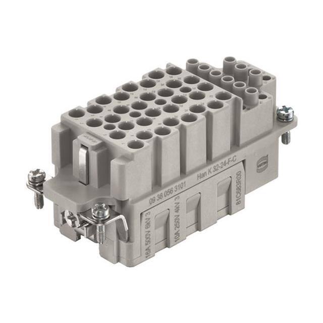 This is manufactured by HARTING. The manufacturer part number is 09380563101. The product is rohs3 compliant. Moreover, it has crimp terminal style. The product also features robust polycarbonate (pc) housing material. The product has -40°c ~ 125°c operating temperature range. The product carries possible position value of 24+32+ground. Moreover, the product has a nominal 250v, 500v voltage rating. It carries ul94 v-0 of material flammability rating. It is shipped in bulk. In addition, female is the available "Gender" of the product. insert without contacts Connector type offer robust functionality. Its typical moisture sensitivity level is 1 (unlimited). It has typical contact type of han® d, han® e. It has a long 15 weeks standard lead time. Additionally, the product's output is 10a, 16a It has a classic gray colour. The product han-com®, is a highly preferred choice for users. The product is available in 16b size.