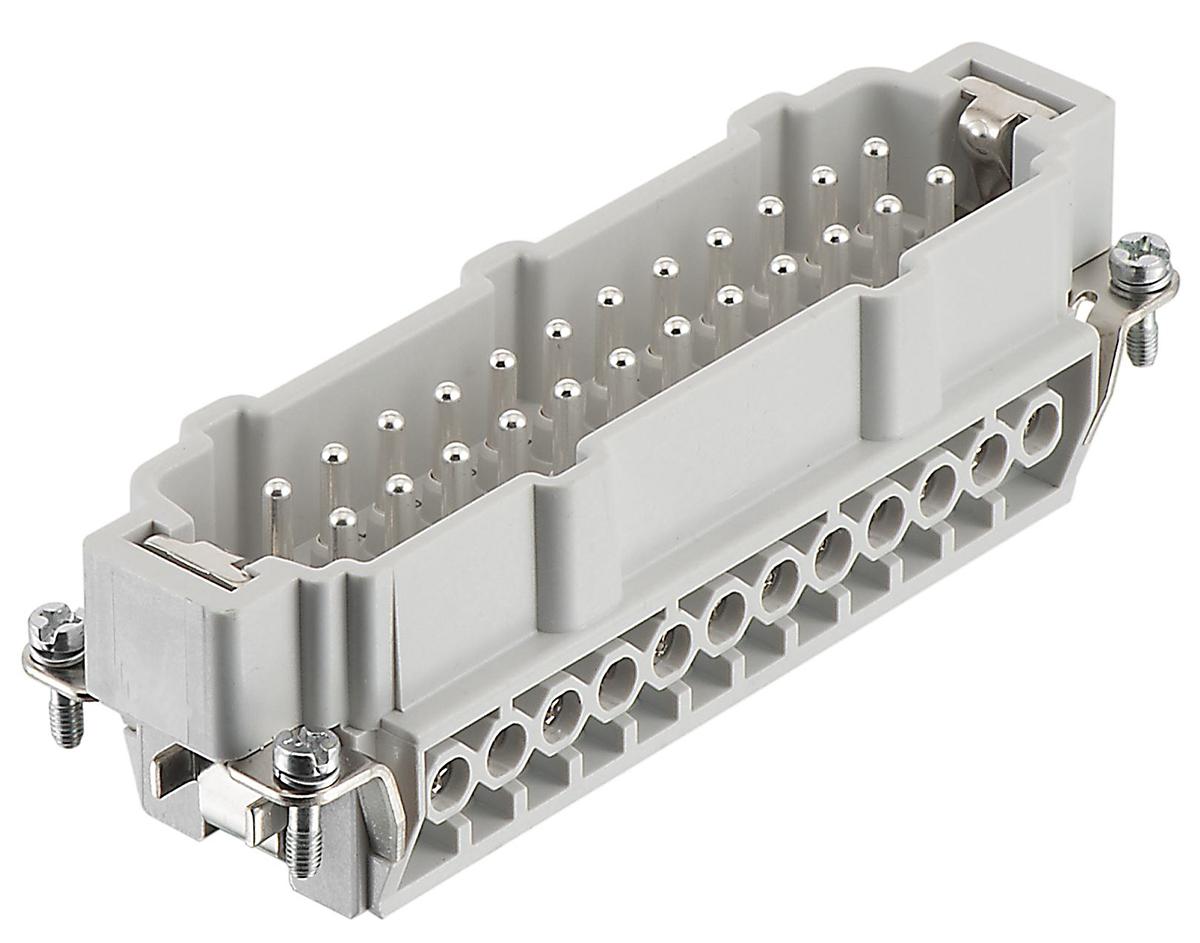 This is E Series size 24 E Connector Insert Male 25 Way 16A 500 V 600 V manufactured by RS Pro. The manufacturer part number is 171-5738. The product has a current rating of 16a. Moreover, the product has a nominal 500 v, 600 v voltage rating. In addition, male is the available "Gender" of the product. It comes in 2 of rows. The product contains 24 contacts. It comes in connector insert configuration. The product is made from sturdy copper alloy materials.