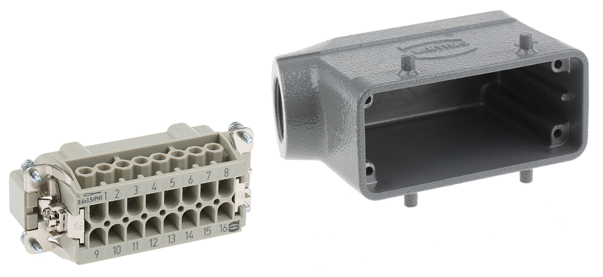 This is Han E Series 16 Way Male 16A Connector Kit includes Hood Insert manufactured by Harting. The manufacturer part number is 09330162601+19300161521. The product has a current rating of 16a. Whereas, the 16 b is the manufacture's size code. In addition, male is the available "Gender" of the product. Moreover, the product has a nominal 500 v voltage rating. It has a typical thread size of m25. The product han e, is a highly preferred choice for users. The product contains 16 contacts. It comes in connector set configuration.