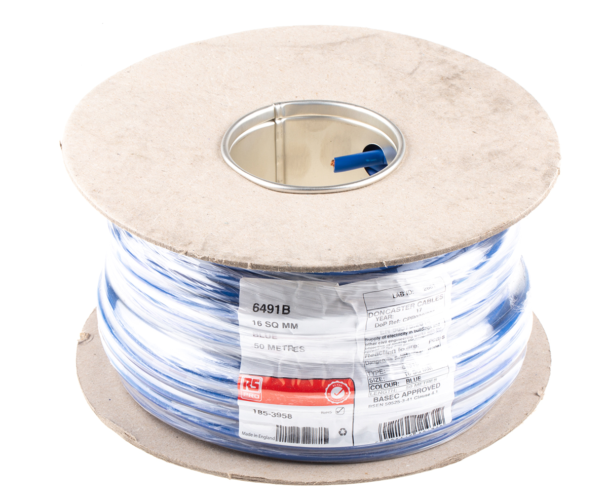 This is 6491B 16.0 LSNH BLUE 50 MTR RLS manufactured by RS PRO. The manufacturer part number is 185-3958. Moreover, the product has a nominal 450 v dc, 750 v ac voltage rating. It is a typical 6491b cable. Its accurate length is 50m.