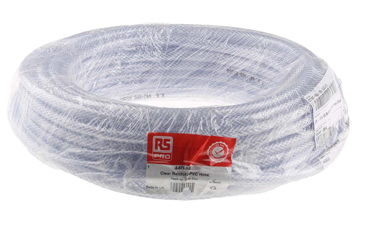 This is PVC Flexible Tubing transparent 10mm External Diameter 25m Long Reinforced 20mm Bend Radius manufactured by RS Pro. The manufacturer part number is 440-868. Whereas, the minimum operating temperature of the product is -15°c. It has a maximum operating temperature of +60°c. The product is made from highly stable and reliable pvc. Its accurate length is 25m. Features a 20mm bend radius.