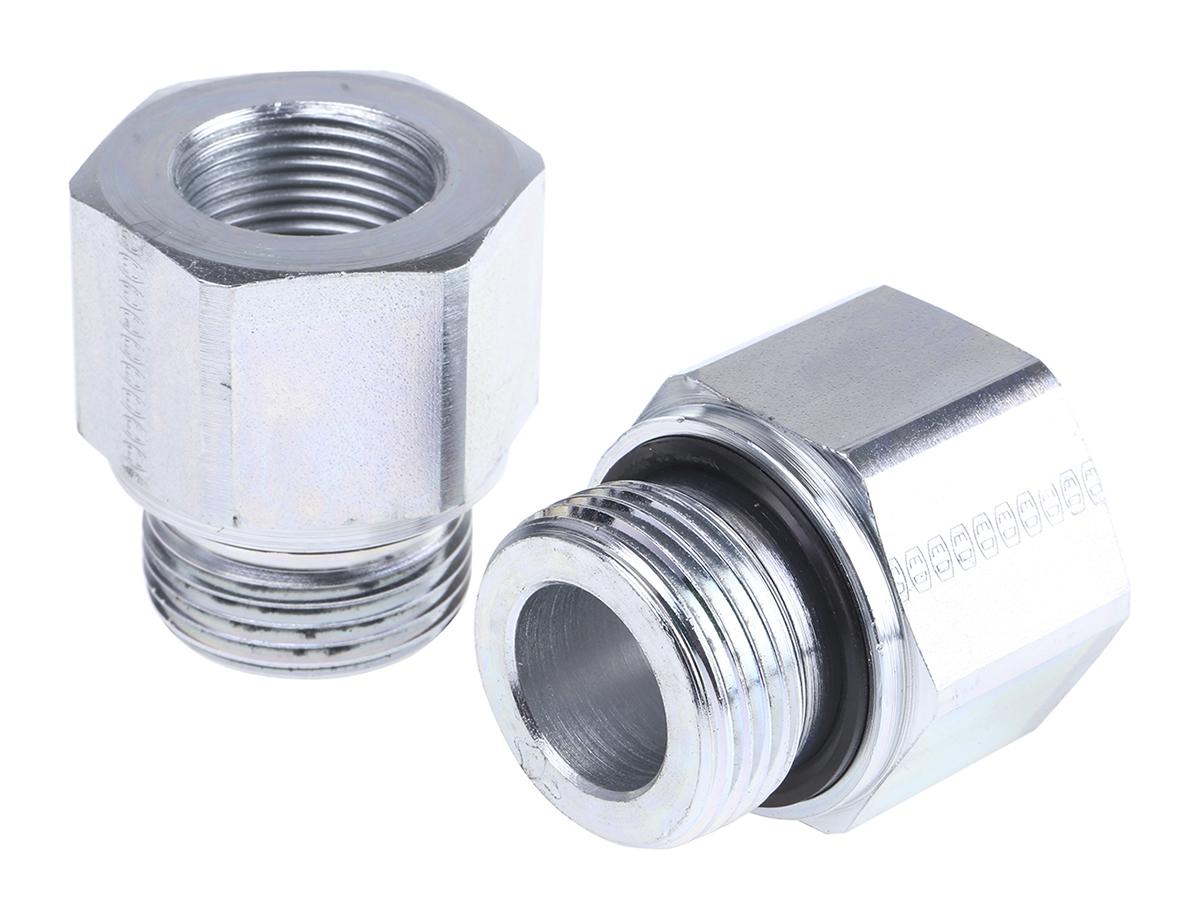 This is Hydraulic Straight Threaded Reducer Connector A G 1 Male Connector B G 3/4 Female manufactured by Parker. The manufacturer part number is RI1EDX3/4CF. A quality product with a nice zinc plated finish. The product is made from highly stable and reliable steel. It has a maximum operating temperature of +100°c. Whereas, the minimum operating temperature of the product is -30°c.