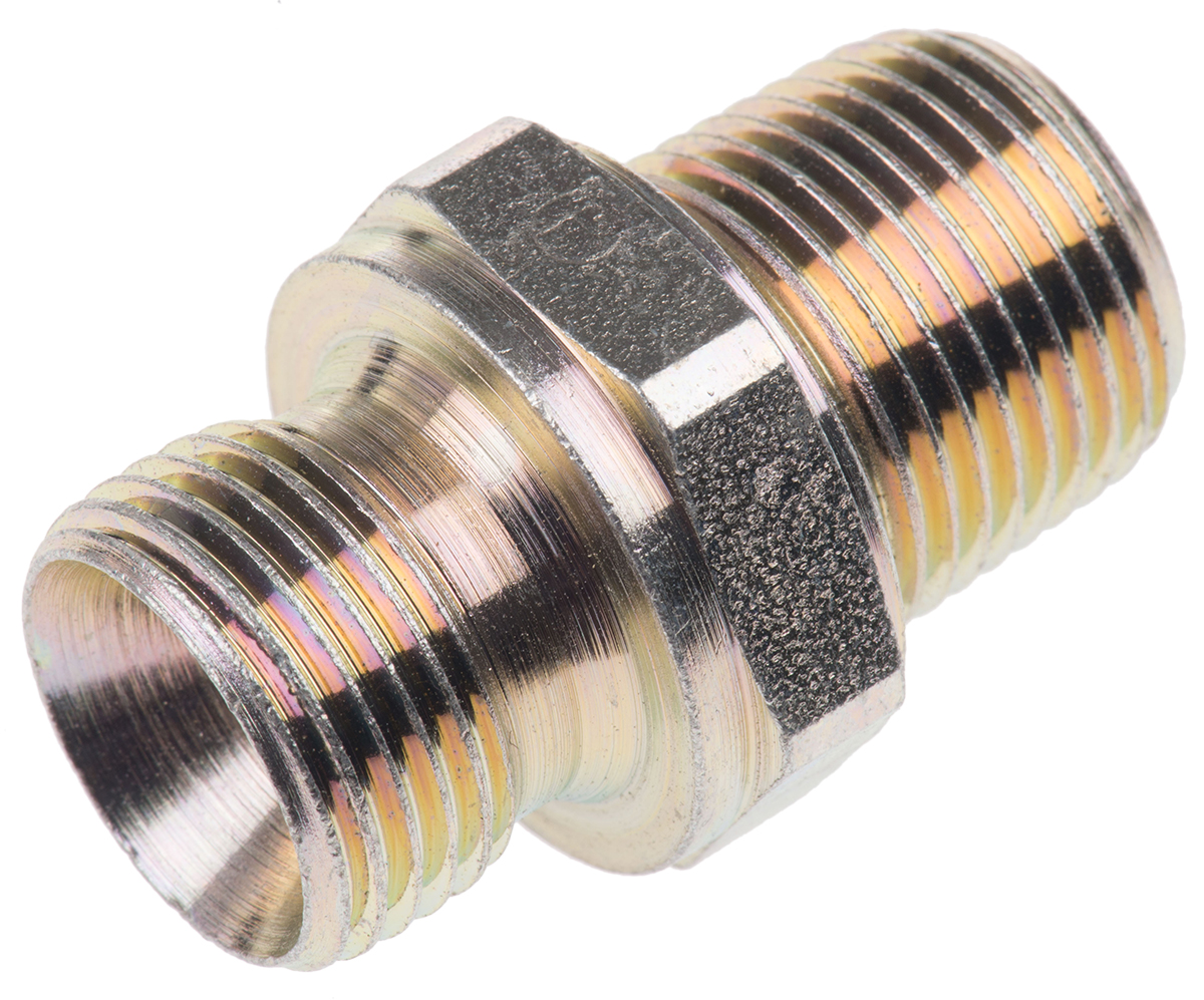 This is Hydraulic Straight Threaded Adapter Connector A G 3/8 Male Connector B R 3/8 Male manufactured by Parker. The manufacturer part number is 6-6F3MK4S. A quality product with a nice zinc plated finish. The product is made from highly stable and reliable steel. It has a maximum operating temperature of +120°c. Whereas, the minimum operating temperature of the product is -40°c.
