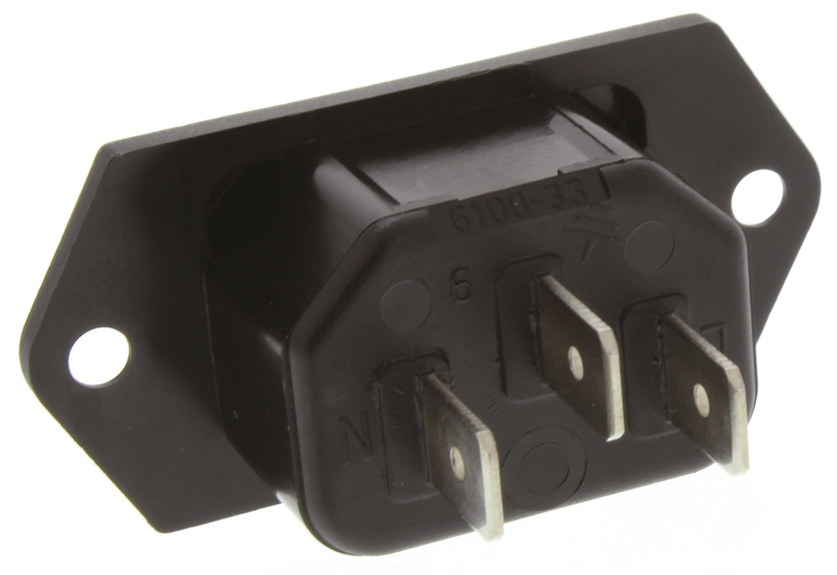 This is C14 Panel Mount IEC Plug manufactured by Schurter. The manufacturer part number is 6100.3300. The product has a current rating of 10a. The product is available in panel mount configuration. Moreover, the product has a nominal 250 v voltage rating. In addition, male is the available "Gender" of the product.