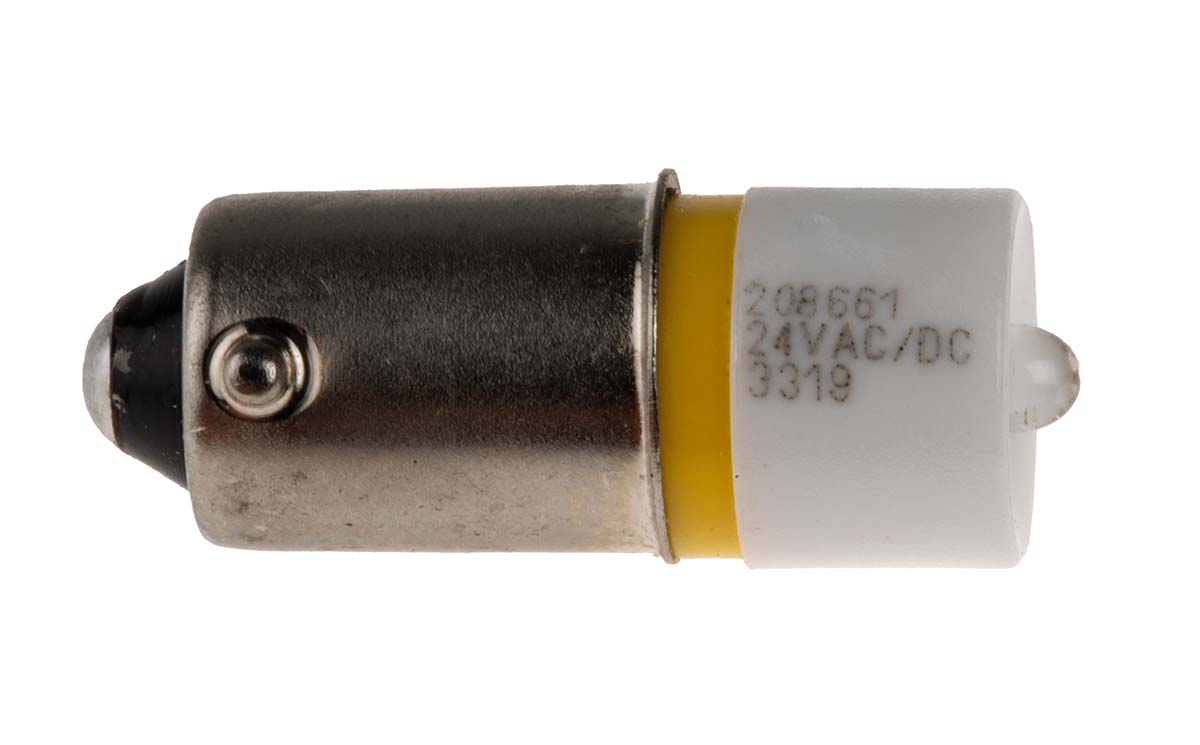 This is LED Reflector Bulb BA9s Yellow Single Chip 10mm dia. 24 V ac/dc manufactured by RS Pro. The manufacturer part number is 208-661. Its diameter is 10mm. Moreover, the product has a nominal 24v ac/dc voltage rating. Its accurate length is 24mm. It is a type of led lamp.