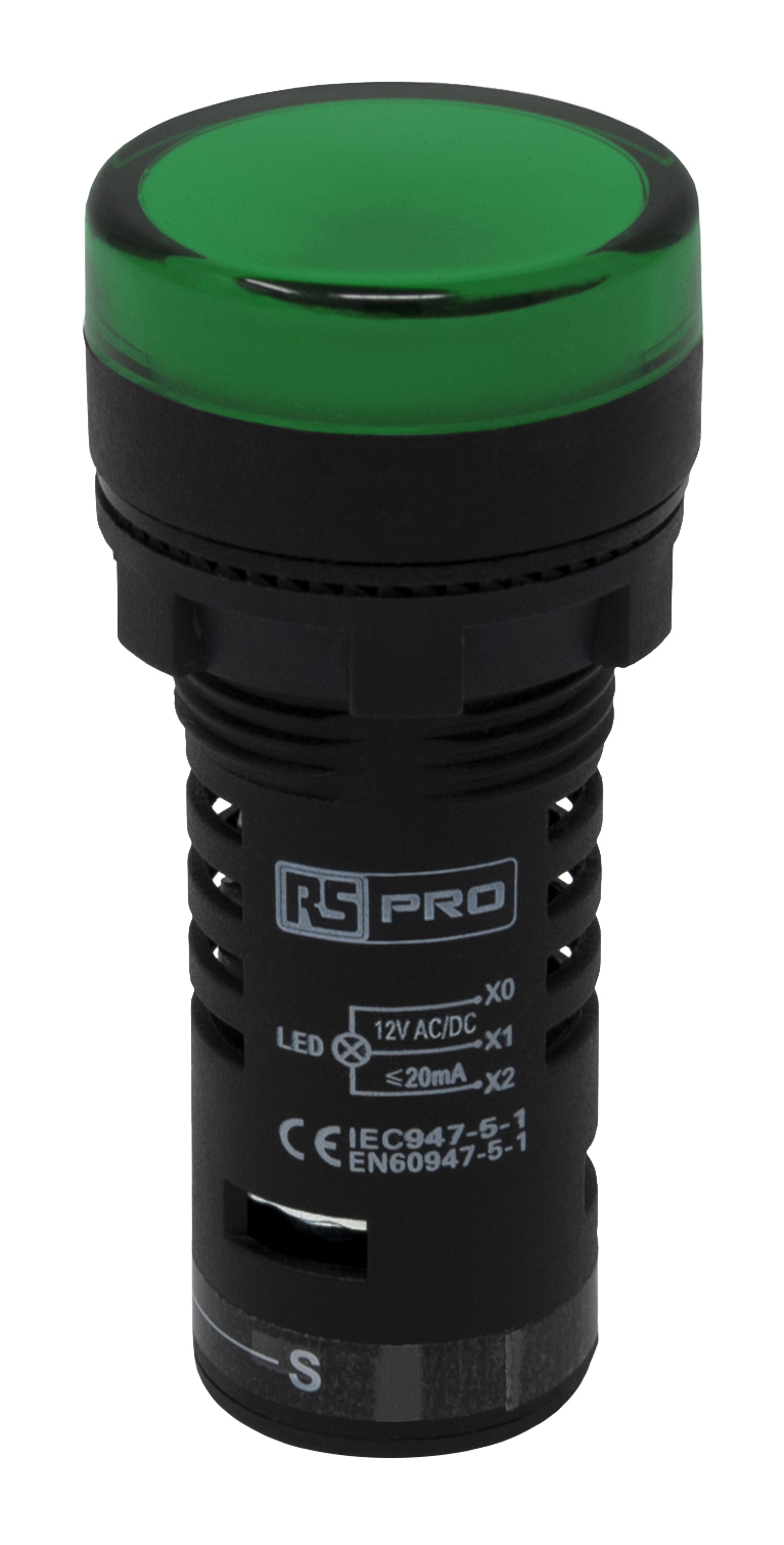 This is Green LED Pilot Light Complete With Test Circuit 22mm Cutout IP65 Round 12 V ac/dc 20 mA manufactured by RS Pro. The manufacturer part number is 909-2493.