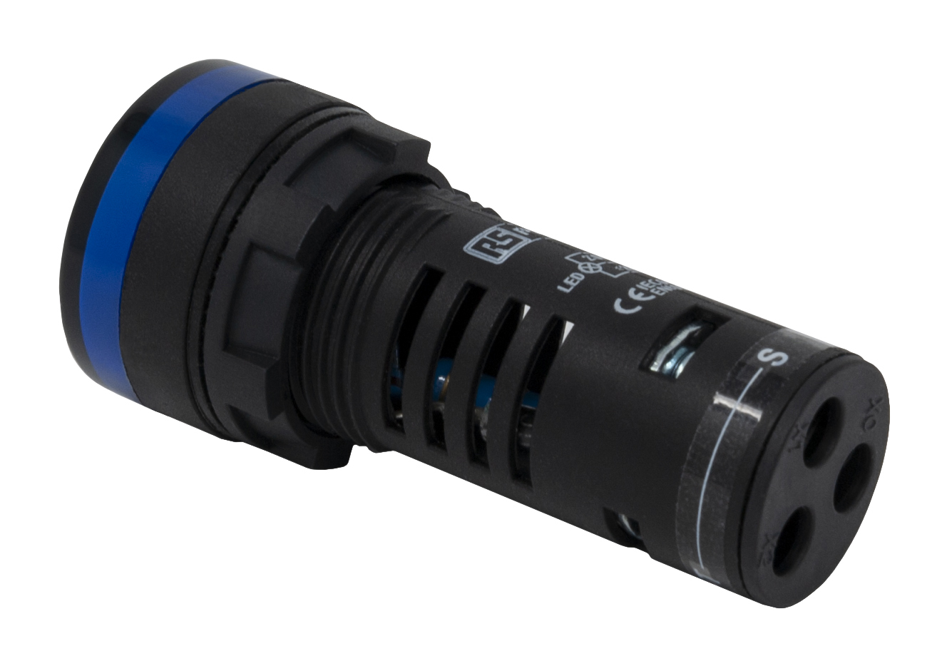 This is Blue LED Pilot Light Complete With Test Circuit 22mm Cutout IP65 Round 120 V ac/dc 20 mA manufactured by RS Pro. The manufacturer part number is 909-2496.