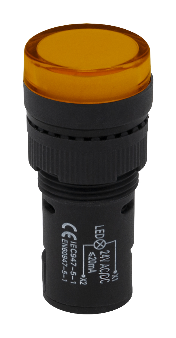 This is Yellow LED Pilot Light 16mm Cutout IP40 Round 24 V ac/dc 20 mA manufactured by RS Pro. The manufacturer part number is 909-2477.