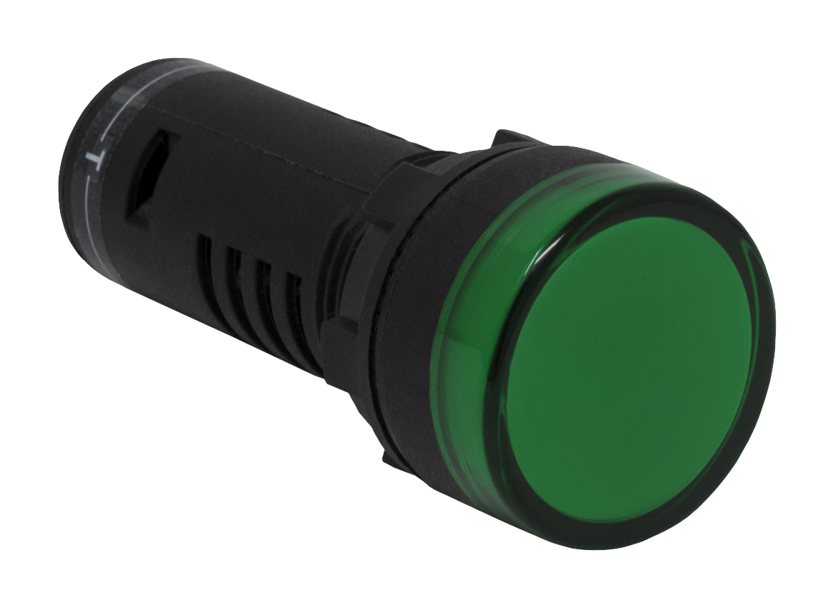 This is Green LED Pilot Light Complete With Test Circuit 22mm Cutout IP65 Round 120 V ac/dc 20 mA manufactured by RS Pro. The manufacturer part number is 909-2506.