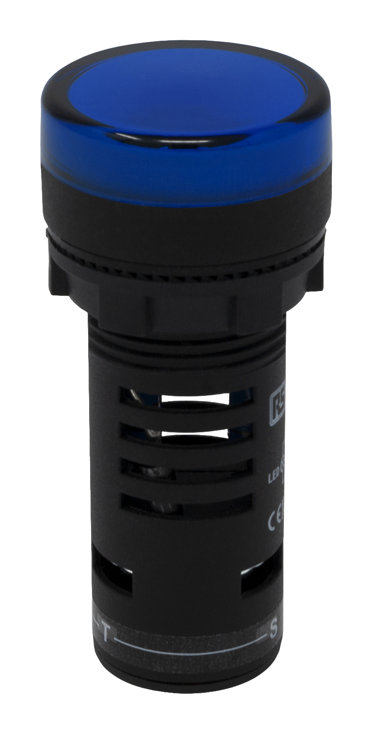 This is Blue LED Pilot Light Complete With Test Circuit 22mm Cutout IP65 Round 12 V ac/dc 20 mA manufactured by RS Pro. The manufacturer part number is 909-2483.
