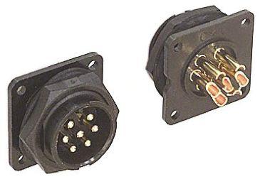 This is MAXI-CON-X Series 7 Pole Panel Mount Connector Plug with Male Contacts IP67 manufactured by Switchcraft. The manufacturer part number is 14182-7PG-300. The product has a current rating of 23.0a. The product is available in panel mount configuration. The product maxi-con-x, is a highly preferred choice for users. Moreover, the product has a nominal 600.0 v voltage rating. The product also features robust nylon housing material. The product contains 7 contacts. The product is made from sturdy brass materials.