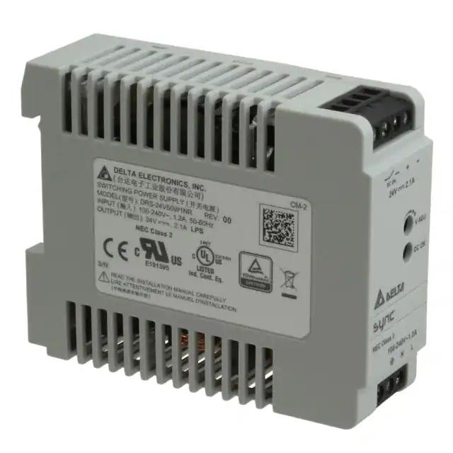 This is manufactured by Delta Electronics. The manufacturer part number is DRS-24V50W1NR. It is assigned with possible HTSUS value of 8504.40.9510. The product is rohs3 compliant. It has a 24v output voltage. The product features power and watts of 50w. The maximum product's output current is 2.1a. It is approved by cb, ce, culus, curus, tuv. It carries ac input type. The product is widely employed in ite (commercial). In addition, it is reach unaffected. It is a highly efficient product with an 90% of high efficiency. It is shipped in box. The product's diameters include 3.52" l x 1.18" w x 2.95" h (89.5mm x 30.0mm x 75.0mm). It has a long 52 weeks standard lead time. 3 kv of isolation voltage. Its typical moisture sensitivity level is not applicable. The splendid features of the product include adjustable output, ip20, load sharing, universal input. The product sync (50w), is a highly preferred choice for users. The product has -20°c ~ 70°c (with derating) operating temperature range. Moreover, it corresponds to drs-24, a base product number of the product. Additionally, the product is supplied with 1 outputs. The product is designated with the ear99 code number