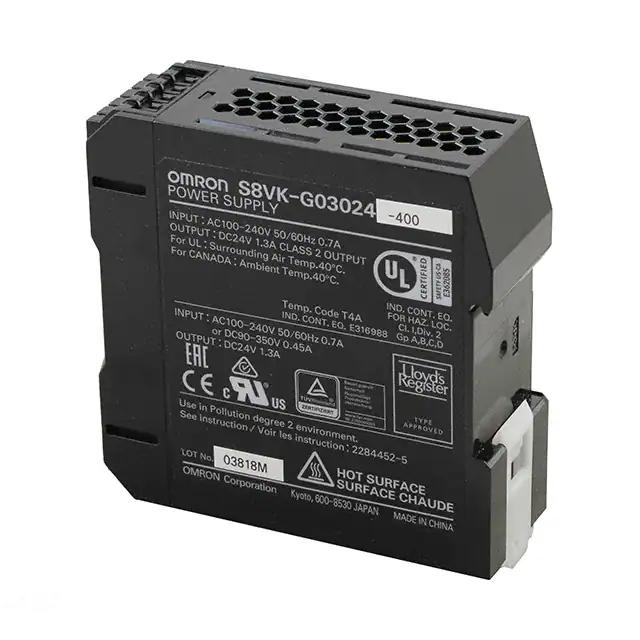 This is manufactured by Omron Automation and Safety. The manufacturer part number is S8VK-G03024-400. It is assigned with possible HTSUS value of 8504.40.6018. Additionally, the product is supplied with 1 outputs. The product features power and watts of 30w. The maximum product's output current is 1.3a. It is approved by ce, culus, curus, tuv. It carries ac input type. The product is widely employed in ite (commercial). It has a 24v output voltage. It is a highly efficient product with an 86% of high efficiency. It is shipped in bulk. The product's diameters include 3.54" l x 1.26" w x 3.54" h (90.0mm x 32.0mm x 90.0mm). 3 v of isolation voltage. Its typical moisture sensitivity level is not applicable. The splendid features of the product include adjustable output, pfc, universal input. The product s8vk-g (30w), is a highly preferred choice for users. The product has -40°c ~ 70°c (with derating) operating temperature range. Moreover, it corresponds to s8vk-g030, a base product number of the product. The product is designated with the ear99 code number