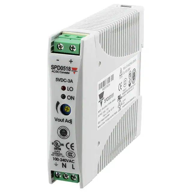 This is manufactured by Carlo Gavazzi Inc.. The manufacturer part number is SPD05181. It is assigned with possible HTSUS value of 8504.40.9510. Additionally, the product is supplied with 1 outputs. It has a 5v output voltage. The product features power and watts of 15w. The maximum product's output current is 3a. It is approved by ccc, ce, culus, curus, tuv. It carries ac or dc input type. The product is widely employed in hazardous locations, industrial, ite (commercial). In addition, it is reach unaffected. It is a highly efficient product with an 75% of high efficiency. It is shipped in box. Does it require minimum load? no. The product's diameters include 4.49" l x 0.89" w x 3.54" h (114.0mm x 22.5mm x 90.0mm). 3 kv of isolation voltage. Its typical moisture sensitivity level is not applicable. The splendid features of the product include adjustable output, ip20, universal input. The product spd (18w), is a highly preferred choice for users. The product has -20°c ~ 71°c (with derating) operating temperature range. Moreover, it corresponds to spd05, a base product number of the product. The product is designated with the ear99 code number