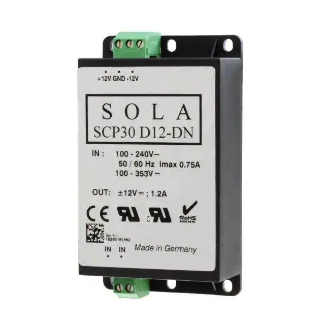This is SCP DIN Rail Power Supply 30W 12V dc/ 1.2A manufactured by SolaHD. The manufacturer part number is SCP30D12-DN. Additionally, the product is supplied with 2 outputs. The product is available in din rail mount configuration. The product scp, is a highly preferred choice for users. In addition, the height is 120mm. Furthermore, the product is 33mm wide. The product comes in 33mm depth. It is assigned with possible HTSUS value of 8504.40.9510. The product is rohs compliant. The product features power and watts of 29w. The maximum product's output current is 1.2a, 1.2a. It is approved by ce, curus. It carries ac or dc input type. The product is widely employed in ite (commercial). It has a 12v output voltage. -12v of voltage output 2. It is a highly efficient product with an 68% of high efficiency. It is shipped in bulk. Does it require minimum load? yes. The product's diameters include 2.55" l x 1.29" w x 4.71" h (65.0mm x 33.0mm x 120.0mm). It has a long 12 weeks standard lead time. Its typical moisture sensitivity level is 1 (unlimited). The splendid features of the product include ip20, universal input. The product scp (30w), is a highly preferred choice for users. The product has -25°c ~ 65°c operating temperature range. Moreover, it corresponds to scp30d12, a base product number of the product. The product is designated with the ear99 code number