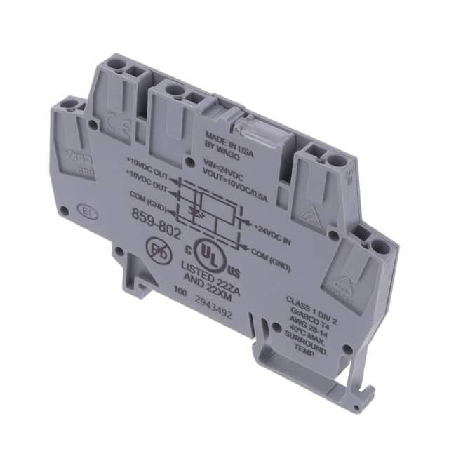 This is manufactured by WAGO Corporation. The manufacturer part number is 859-802. Moreover, it corresponds to 859, a base product number of the product. It is assigned with possible HTSUS value of 8504.40.9580. The product is rohs3 compliant. In addition, it is reach unaffected. The maximum product's output current is 500ma. It is approved by ce, ul. It carries dc input type. The product is widely employed in industrial. It has a 10v output voltage. It is a highly efficient product with an 85% of high efficiency. It is shipped in bulk. The product's diameters include 3.58" l x 0.24" w x 2.21" h (91.0mm x 6.0mm x 56.0mm). It has a long 8 weeks standard lead time. Its typical moisture sensitivity level is 1 (unlimited). The splendid features of the product include adjustable output. The product has -25°c ~ 55°c operating temperature range. Standard number include: 508. Additionally, the product is supplied with 1 outputs. The product is designated with the ear99 code number