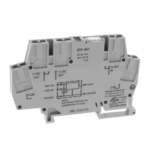 This is manufactured by WAGO Corporation. The manufacturer part number is 859-801. Moreover, it corresponds to 859, a base product number of the product. It is assigned with possible HTSUS value of 8504.40.9580. The product is rohs3 compliant. In addition, it is reach unaffected. The maximum product's output current is 500ma. It is approved by ce, ul. It carries dc input type. The product is widely employed in industrial. It has a 5v output voltage. It is a highly efficient product with an 70% of high efficiency. It is shipped in bulk. The product's diameters include 3.58" l x 0.24" w x 2.21" h (91.0mm x 6.0mm x 56.0mm). It has a long 8 weeks standard lead time. Its typical moisture sensitivity level is 1 (unlimited). The splendid features of the product include adjustable output. The product has 0°c ~ 40°c operating temperature range. Standard number include: 508. Additionally, the product is supplied with 1 outputs. The product is designated with the ear99 code number