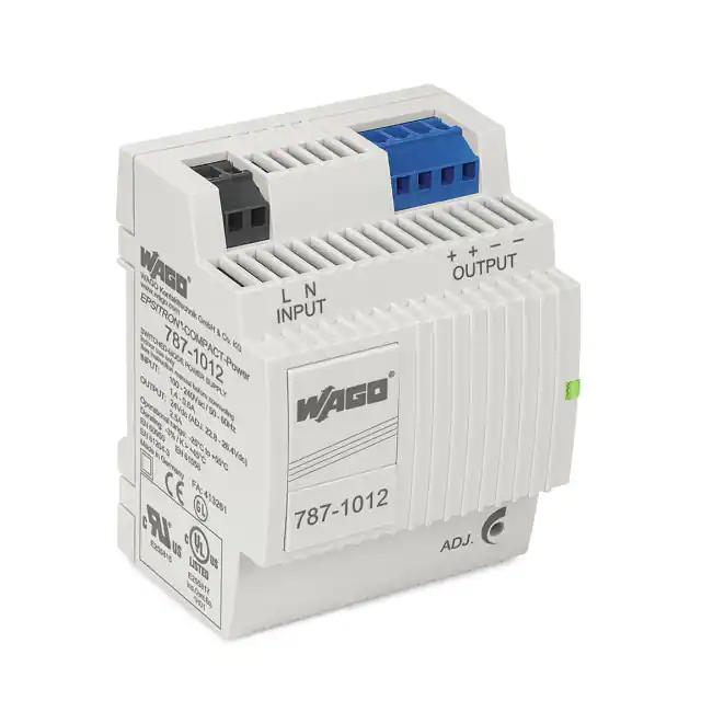 This is manufactured by WAGO Corporation. The manufacturer part number is 787-1012. It is assigned with possible HTSUS value of 8504.40.9520. The product is rohs3 compliant. The product features power and watts of 60w. The maximum product's output current is 2.5a. It is approved by curus, eac, ul. It carries ac or dc input type. The product is widely employed in industrial, ite (commercial), laboratory. It has a 24v output voltage. It is a highly efficient product with an 88% of high efficiency. It is shipped in box. The product's diameters include 2.17" l x 2.83" w x 3.50" h (55.0mm x 72.0mm x 89.0mm). It has a long 12 weeks standard lead time. 4.242 kv of isolation voltage. Its typical moisture sensitivity level is not applicable. The splendid features of the product include adjustable output, ip20, pfc, universal input. The product has -25°c ~ 60°c operating temperature range. Standard number include: 60950-1; 61010-1; ul 508. Additionally, the product is supplied with 1 outputs. The product is designated with the ear99 code number