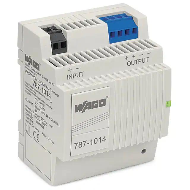 This is manufactured by WAGO Corporation. The manufacturer part number is 787-1014. It is assigned with possible HTSUS value of 8504.40.9510. The product is rohs3 compliant. The product features power and watts of 48w. The maximum product's output current is 2a. It is approved by eac. It carries dc input type. The product is widely employed in industrial, ite (commercial), laboratory. It has a 24v output voltage. It is a highly efficient product with an 85% of high efficiency. It is shipped in box. The product's diameters include 2.17" l x 2.83" w x 3.50" h (55.0mm x 72.0mm x 89.0mm). It has a long 12 weeks standard lead time. 4.242 kv of isolation voltage. Its typical moisture sensitivity level is not applicable. The splendid features of the product include ip20. The product has -40°c ~ 70°c operating temperature range. Standard number include: 60950-1; 61010-1; ul 508. Additionally, the product is supplied with 1 outputs. The product is designated with the ear99 code number