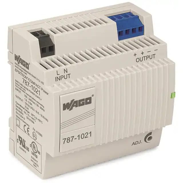 This is manufactured by WAGO Corporation. The manufacturer part number is 787-1021. It is assigned with possible HTSUS value of 8504.40.9520. The product is rohs3 compliant. The product features power and watts of 78w. The maximum product's output current is 6.5a. It is approved by curus, eac, ul. It carries ac or dc input type. The product is widely employed in industrial, ite (commercial), laboratory. It has a 12v output voltage. It is a highly efficient product with an 87% of high efficiency. It is shipped in box. The product's diameters include 2.17" l x 3.54" w x 3.50" h (55.0mm x 90.0mm x 89.0mm). It has a long 12 weeks standard lead time. 4.242 kv of isolation voltage. Its typical moisture sensitivity level is not applicable. The splendid features of the product include adjustable output, ip20, pfc, universal input. The product has -25°c ~ 60°c operating temperature range. Standard number include: 60950-1; 61010-1; ul 508. Additionally, the product is supplied with 1 outputs. The product is designated with the ear99 code number
