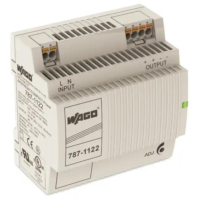 This is manufactured by WAGO Corporation. The manufacturer part number is 787-1122. It is assigned with possible HTSUS value of 8504.40.9520. Additionally, the product is supplied with 1 outputs. The product features power and watts of 96w. The maximum product's output current is 4a. It is approved by curus, eac, ul. It carries ac or dc input type. The product is widely employed in industrial, ite (commercial), laboratory. It has a 24v output voltage. It is a highly efficient product with an 88% of high efficiency. It is shipped in box. The product's diameters include 2.17" l x 3.54" w x 3.50" h (55.0mm x 90.0mm x 89.0mm). It has a long 12 weeks standard lead time. 4.242 kv of isolation voltage. Its typical moisture sensitivity level is not applicable. The splendid features of the product include adjustable output, ip20, pfc, universal input. The product has -25°c ~ 70°c operating temperature range. Standard number include: 60950-1; 61010-1; ul 508. The product is designated with the ear99 code number