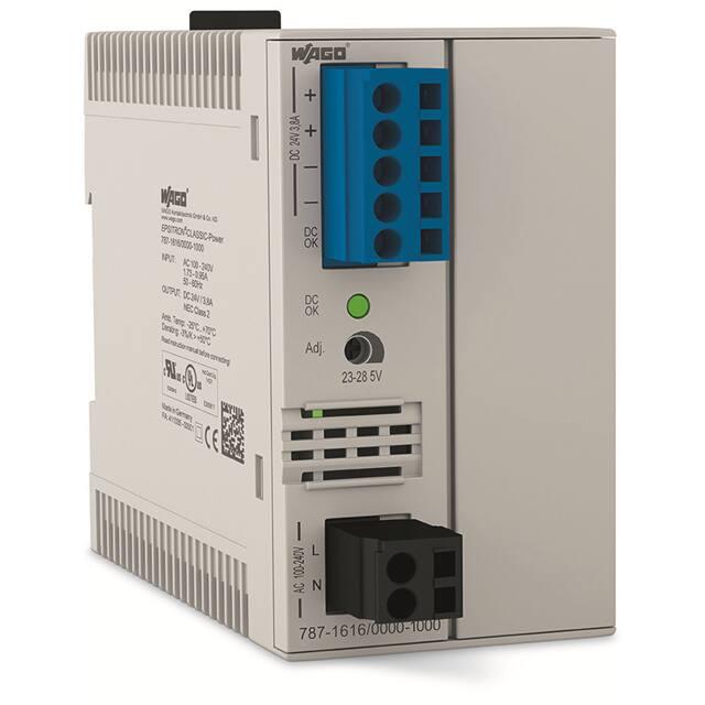 This is manufactured by WAGO Corporation. The manufacturer part number is 787-1616/000-1000. It is assigned with possible HTSUS value of 8504.40.9520. The product is rohs3 compliant. The product features power and watts of 91w. The maximum product's output current is 3.8a. It is approved by curus, eac, ul. It carries ac or dc input type. The product is widely employed in household appliances, industrial, ite (commercial), laboratory. It has a 24v output voltage. It is a highly efficient product with an 87% of high efficiency. It is shipped in box. The product's diameters include 4.69" l x 2.05" w x 3.54" h (119.0mm x 52.0mm x 90.0mm). It has a long 12 weeks standard lead time. 4.242 kv of isolation voltage. Its typical moisture sensitivity level is not applicable. The splendid features of the product include adjustable output, ip20, pfc, universal input. The product has -25°c ~ 70°c operating temperature range. Standard number include: 60335-1; 60950-1; 61010-1; ul 508. Additionally, the product is supplied with 1 outputs. The product is designated with the ear99 code number