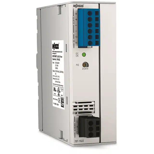 This is manufactured by WAGO Corporation. The manufacturer part number is 787-1622. It is assigned with possible HTSUS value of 8504.40.9520. The product is rohs3 compliant. The product features power and watts of 120w. The maximum product's output current is 5a. It is approved by curus, eac, ul. It carries ac or dc input type. The product is widely employed in industrial, ite (commercial), laboratory. It has a 24v output voltage. It is a highly efficient product with an 89% of high efficiency. It is shipped in box. The product's diameters include 5.41" l x 2.83" w x 5.00" h (137.5mm x 72.0mm x 127.0mm). It has a long 12 weeks standard lead time. 4.242 kv of isolation voltage. Its typical moisture sensitivity level is not applicable. The splendid features of the product include adjustable output, ip20, pfc, universal input. The product has -25°c ~ 70°c operating temperature range. Standard number include: 60950-1; 61010-1; ul 508. Additionally, the product is supplied with 1 outputs. The product is designated with the ear99 code number