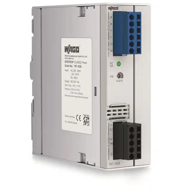 This is manufactured by WAGO Corporation. The manufacturer part number is 787-1628. It is assigned with possible HTSUS value of 8504.40.9520. The product is rohs3 compliant. The product features power and watts of 120w. The maximum product's output current is 5a. It is approved by curus, eac, ul. It carries ac or dc input type. The product is widely employed in industrial, ite (commercial), laboratory. It has a 24v output voltage. It is a highly efficient product with an 89% of high efficiency. It is shipped in box. The product's diameters include 5.65" l x 1.65" w x 5.00" h (143.5mm x 42.0mm x 127.0mm). It has a long 12 weeks standard lead time. 4.242 kv of isolation voltage. Its typical moisture sensitivity level is not applicable. The splendid features of the product include adjustable output, ip20, pfc, universal input. The product has -25°c ~ 70°c operating temperature range. Standard number include: 60950-1; 61010-1; ul 508. Additionally, the product is supplied with 1 outputs. The product is designated with the ear99 code number