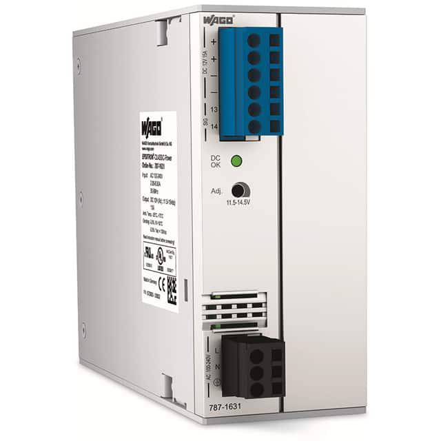 This is manufactured by WAGO Corporation. The manufacturer part number is 787-1631. It is assigned with possible HTSUS value of 8504.40.9530. The product is rohs3 compliant. The product features power and watts of 180w. The maximum product's output current is 15a. It is approved by curus, ul. It carries ac or dc input type. The product is widely employed in industrial, ite (commercial). It has a 12v output voltage. It is a highly efficient product with an 90% of high efficiency. It is shipped in box. The product's diameters include 6.77" l x 2.17" w x 5.00" h (172.0mm x 55.0mm x 127.0mm). It has a long 12 weeks standard lead time. 4.242 kv of isolation voltage. Its typical moisture sensitivity level is not applicable. The splendid features of the product include adjustable output, ip20, pfc, universal input. The product has -25°c ~ 70°c operating temperature range. Standard number include: 60950-1; ul 508. Additionally, the product is supplied with 1 outputs. The product is designated with the ear99 code number