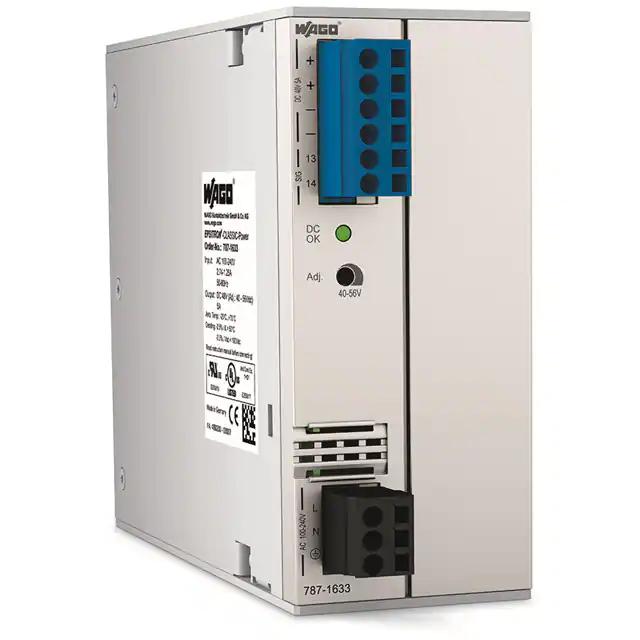 This is manufactured by WAGO Corporation. The manufacturer part number is 787-1633. It is assigned with possible HTSUS value of 8504.40.9530. The product is rohs3 compliant. The product features power and watts of 240w. The maximum product's output current is 5a. It is approved by curus, ul. It carries ac or dc input type. The product is widely employed in industrial, ite (commercial). It has a 48v output voltage. It is a highly efficient product with an 92% of high efficiency. It is shipped in box. The product's diameters include 6.77" l x 2.17" w x 5.00" h (172.0mm x 55.0mm x 127.0mm). It has a long 12 weeks standard lead time. 4.242 kv of isolation voltage. Its typical moisture sensitivity level is not applicable. The splendid features of the product include adjustable output, ip20, pfc, universal input. The product has -25°c ~ 70°c operating temperature range. Standard number include: 60950-1; ul 508. Additionally, the product is supplied with 1 outputs. The product is designated with the ear99 code number