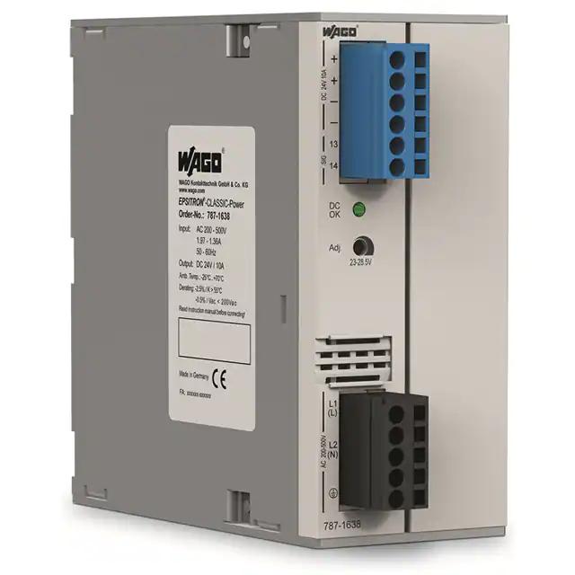 This is manufactured by WAGO Corporation. The manufacturer part number is 787-1638. It is assigned with possible HTSUS value of 8504.40.9530. The product is rohs3 compliant. The product features power and watts of 240w. The maximum product's output current is 10a. It is approved by curus, ul. It carries ac or dc input type. The product is widely employed in industrial, ite (commercial). It has a 24v output voltage. It is a highly efficient product with an 89% of high efficiency. It is shipped in box. The product's diameters include 5.77" l x 2.17" w x 5.00" h (146.5mm x 55.0mm x 127.0mm). It has a long 12 weeks standard lead time. 4.242 kv of isolation voltage. Its typical moisture sensitivity level is not applicable. The splendid features of the product include industrial, ite (commercial). The product has -25°c ~ 70°c operating temperature range. Standard number include: 60950-1; ul 508. Additionally, the product is supplied with 1 outputs. The product is designated with the ear99 code number