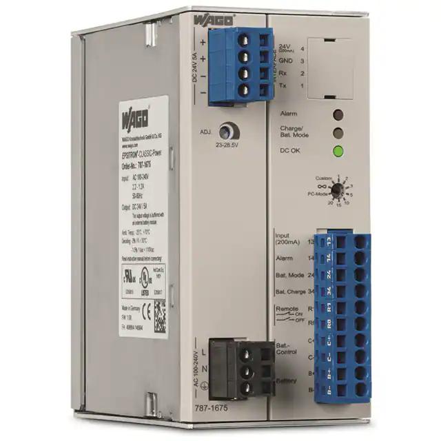 This is manufactured by WAGO Corporation. The manufacturer part number is 787-1675. It is assigned with possible HTSUS value of 8504.40.9520. The product is rohs3 compliant. The product features power and watts of 120w. The maximum product's output current is 5a. It is approved by curus, eac, ul. It carries ac or dc input type. The product is widely employed in industrial, ite (commercial), laboratory. It has a 24v output voltage. It is a highly efficient product with an 88% of high efficiency. It is shipped in box. The product's diameters include 5.34" l x 2.36" w x 5.00" h (135.5mm x 60.0mm x 127.0mm). It has a long 12 weeks standard lead time. 4.242 kv of isolation voltage. Its typical moisture sensitivity level is not applicable. The splendid features of the product include adjustable output, ip20, pfc, universal input. The product has -25°c ~ 70°c operating temperature range. Standard number include: 60950-1; 61010-1; ul 508. Additionally, the product is supplied with 1 outputs. The product is designated with the ear99 code number