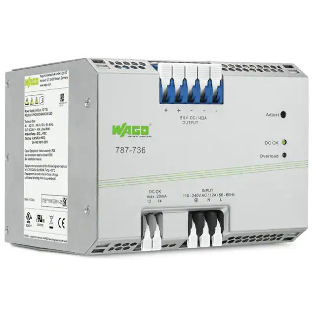 This is manufactured by WAGO Corporation. The manufacturer part number is 787-736. The product is rohs3 compliant. The product features power and watts of 960w. The maximum product's output current is 40a. It is approved by ul. It carries ac or dc input type. The product is widely employed in industrial, ite (commercial). It has a 24v output voltage. It is a highly efficient product with an 90% of high efficiency. It is shipped in box. The product's diameters include 5.91" l x 6.69" w x 53.39" h (150.1mm x 169.9mm x 1356.0mm). It has a long 12 weeks standard lead time. 4.242 kv of isolation voltage. Its typical moisture sensitivity level is not applicable. The splendid features of the product include adjustable output, ip20, pfc, universal input. The product has -20°c ~ 70°c operating temperature range. Standard number include: 60950-1; 62368-1; ul 508. Additionally, the product is supplied with 1 outputs.