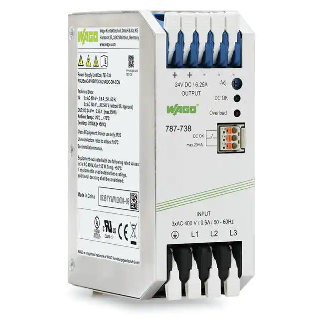 This is manufactured by WAGO Corporation. The manufacturer part number is 787-738. It is assigned with possible HTSUS value of 8504.40.9520. The product is rohs3 compliant. The product features power and watts of 150w. The maximum product's output current is 6.25a. It is approved by curus, ul. It carries ac or dc input type. The product is widely employed in industrial, ite (commercial). It has a 24v output voltage. It is a highly efficient product with an 87% of high efficiency. It is shipped in box. The product's diameters include 3.62" l x 1.97" w x 5.12" h (92.0mm x 50.0mm x 130.0mm). It has a long 12 weeks standard lead time. 4.242 kv of isolation voltage. Its typical moisture sensitivity level is not applicable. The splendid features of the product include adjustable output, ip20, pfc, universal input. The product has -25°c ~ 70°c operating temperature range. Standard number include: 60950-1; ul 508. Additionally, the product is supplied with 1 outputs. The product is designated with the ear99 code number